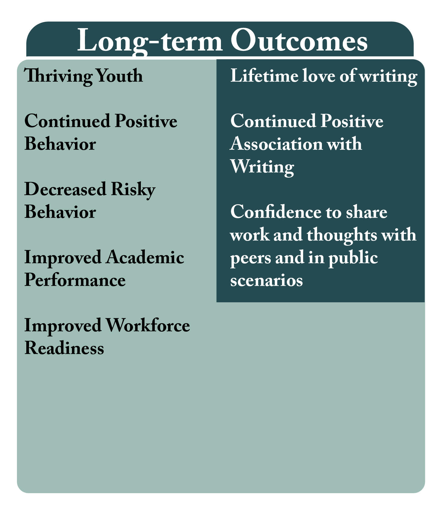 Here is Writopia's Program Logic Model, a graphic that presents what we do, how we do it, and the short-term and long-term effects on our youth.